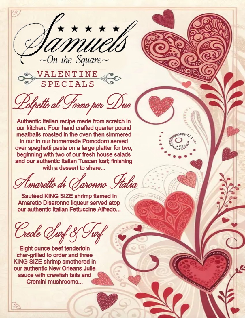 Samuel's on the Square is a sit down, full service, pay at the table destination dinning experience specializing in up-scale Italian cuisine and all American grill featuring the finest quality beef, chicken and seafood for miles around.